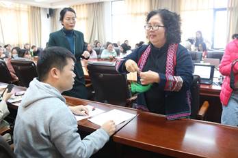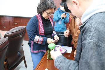 讲座中,吴松懿女士精心设置了实践操作环节,在其带领下,云南省民族博物馆6名馆员逐一指导同学亲手制作艾草香包。在此过程中,同学们热情投入,细致认真。