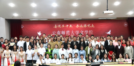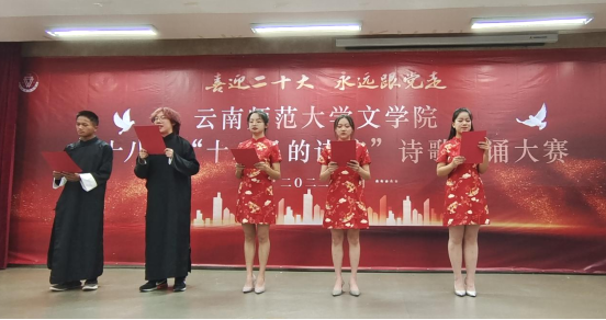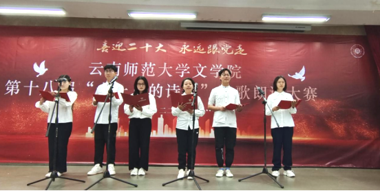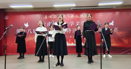 “红色的记忆是永远的丰碑,铿锵的誓言是心中的颂歌。”王力班四名同学身着一袭素净的白裙上场,他们以月光借喻祖国,含蓄而温柔;游国恩班六名同学带来原创诗歌《漂浮的心》,诉尽近代中国的沉沦,而当“心”栖息于红色的中国时,他们却又字字铿锵;沈从文班红色的旗袍格外引人瞩目,一如他们带来的节目——《盛世中国》,诚挚热情地歌颂华夏;冯友兰班八名同学齐上场,其《中华颂》饱含真挚、催人泪下;罗常培班、闻一多班、罗庸班等班级接连亮相,他们有的双手高擎红星,有的身着礼服俊雅端庄,有的传承中华民族优秀文化传统再现风雅……