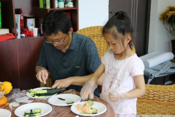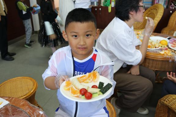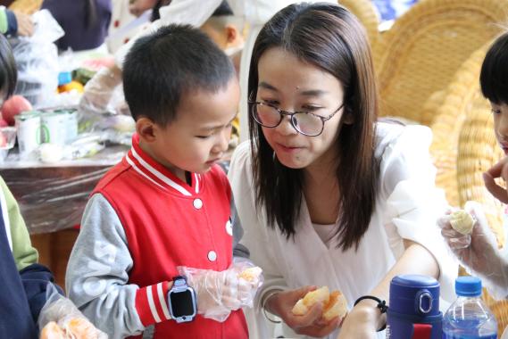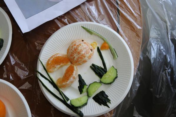 最后,家长们带领小朋友制作水果创意拼盘。活动现场精心为孩子们准备了各种各样的水果,孩子们可根据图片提示或自己的想象制作创意水果拼盘。孩子们在家长的帮助下一起完成水果拼盘的制作。在轻松愉快的亲子氛围中,家长们融入了孩子们的世界,感受着快乐的亲子时光。