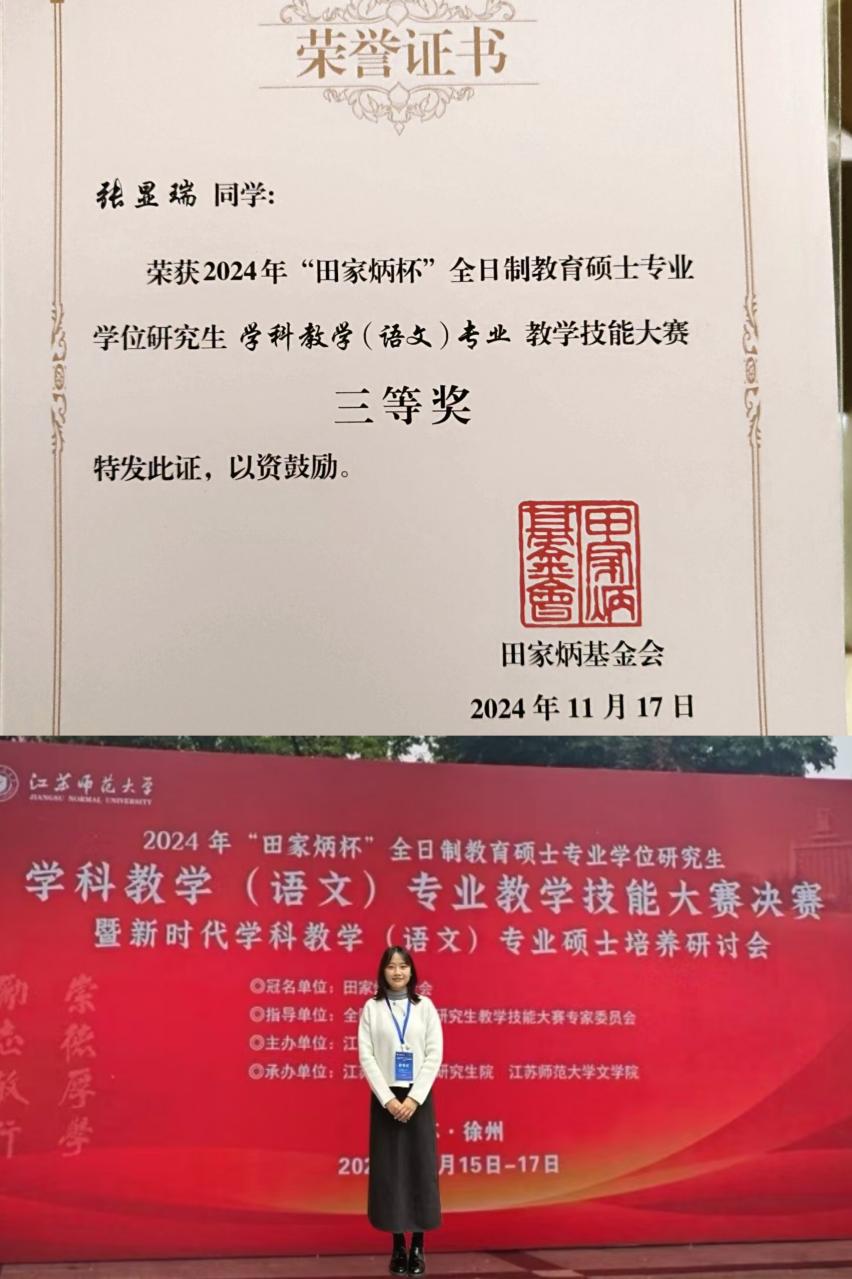2024年全国“田家炳杯”全日制教育硕士专业学位研究生学科教学(语文)专业教学技能大赛决赛于11月15日至17日在江苏师范大学泉山校区举办。Bsports必一体育2022级学科教学(语文)专业硕士研究生张显瑞同学,荣获全国总决赛三等奖。