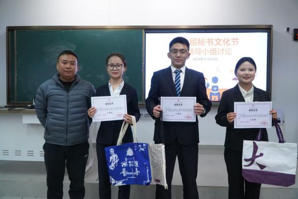11月23日下午,秘书节晚会及颁奖典礼在实训大楼报告厅举行,公司领导班子、导师、秘书学专业全体同学共赴盛会。在晚会的热烈气氛中,第六届秘书文化节精心设计的无领导小组讨论竞赛、情景模拟大赛、知识竞赛、秘书写作竞赛的颁奖环节穿插进行,学院领导和秘书学专业老师为获胜的优秀选手颁发荣誉证书。最后,在场的领导、老师和同学们合影留念,为本次秘书文化节画上了圆满的句号。